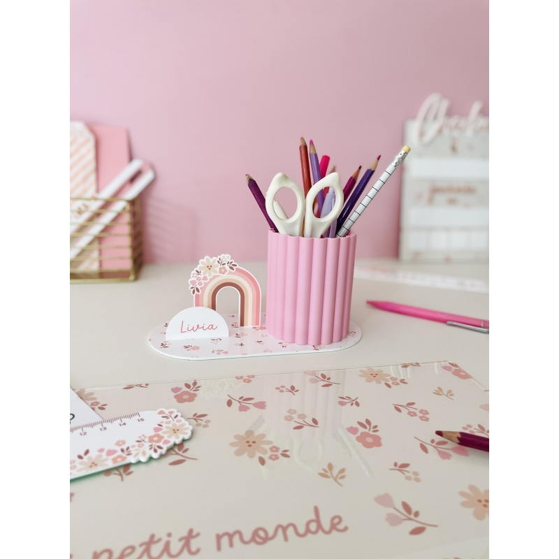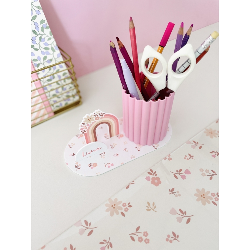 Ce pot à crayons personnalisé transforme le bureau de votre enfant en un coin de travail doux et coloré. Avec son motif Liberty et son arc-en-ciel fleuri, il allie rangement et décoration. Idéal pour organiser les fournitures dès la rentrée scolaire, avec une touche de poésie.