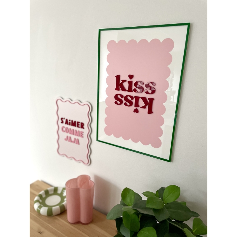 Ajoutez une touche graphique et moderne à votre décoration d'intérieur avec l'affiche en plexiglas "kiss kiss". Le message en rouge se distingue sur un fond rose en forme de feston, le tout encadré en vert. Parfaite pour apporter de la couleur et de la légèreté à votre intérieur, cette affiche en plexiglas sera idéale pour un salon ou une chambre.