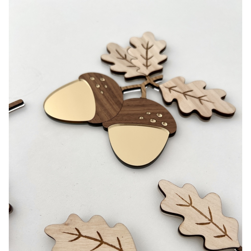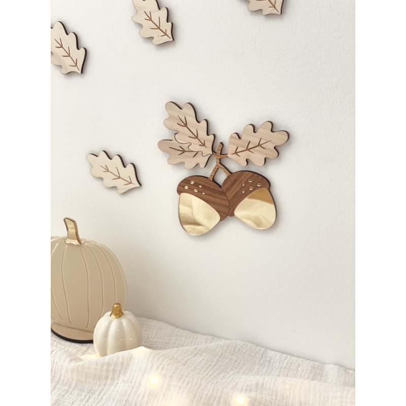 Évoquez la douceur de l'automne avec notre décoration murale en forme de glands d'arbre de chêne, un mélange de bois brut, bois plaqué et plexiglas miroir. Cette pièce intemporelle au design élégant apporte la chaleur de la saison à votre intérieur. Transformez votre espace en un cocon d'automne.