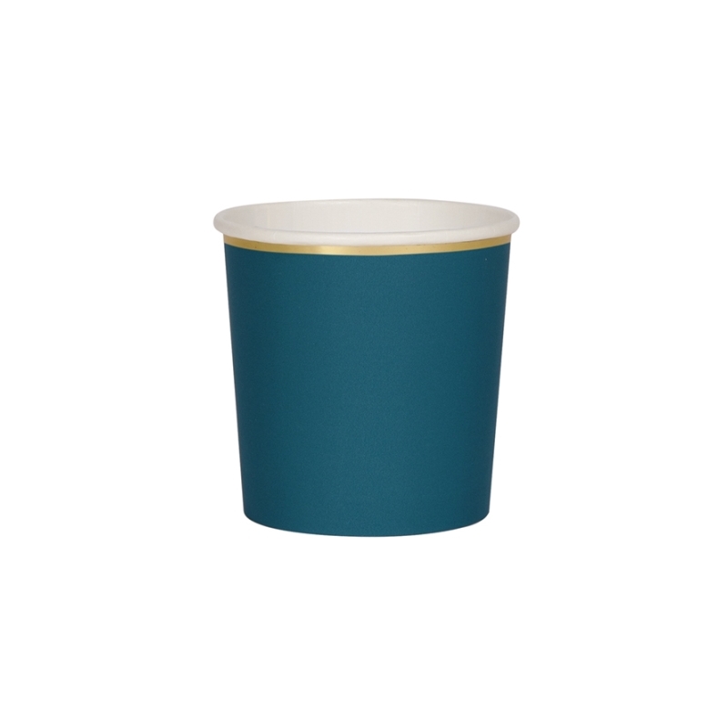 Jolis gobelets de couleur bleu vert avec une élégante finition dorée. Ces gobelets en carton iront bien avec votre thème marin.