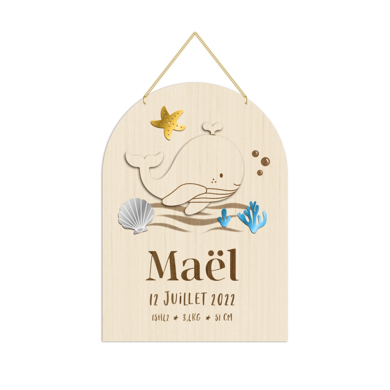 La pancarte et la baleine sont réalisés en bois peuplier, et les éléments en plexiglas (en option).