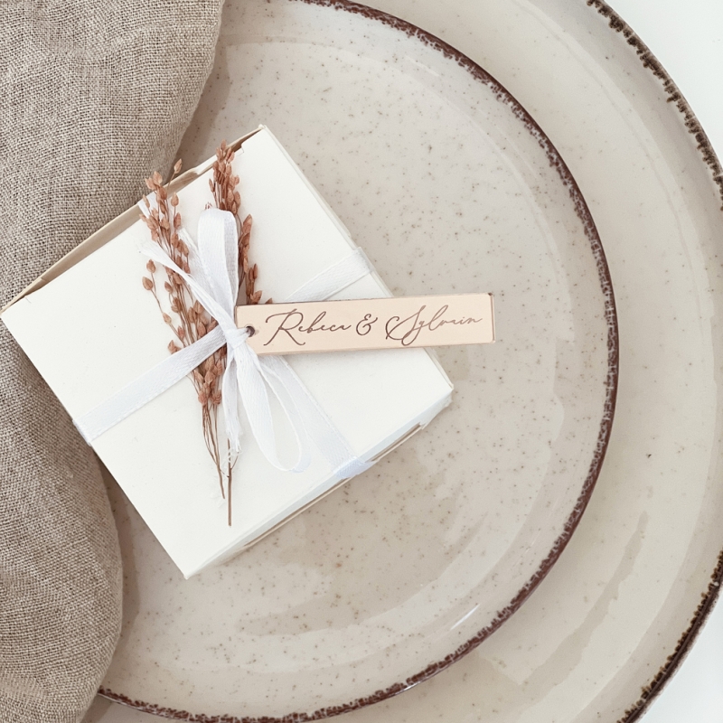 Les étiquettes de mariage permettent d’ajouter un joli détail personnalisé à vos cadeaux d'invités. Gravées de vos prénoms, elles leur laisseront un inoubliable souvenir de votre union. En bois ou en plexiglas, choisissez la matière et la couleur qui s’harmonisera le mieux avec votre thème de mariage.