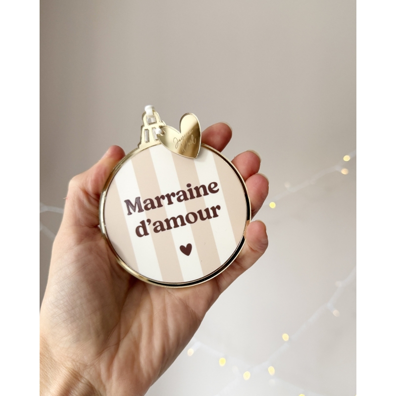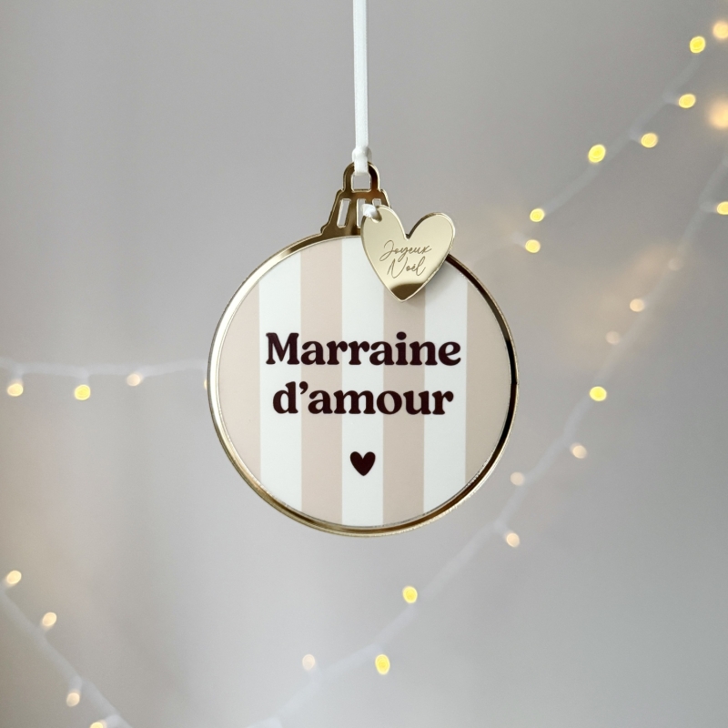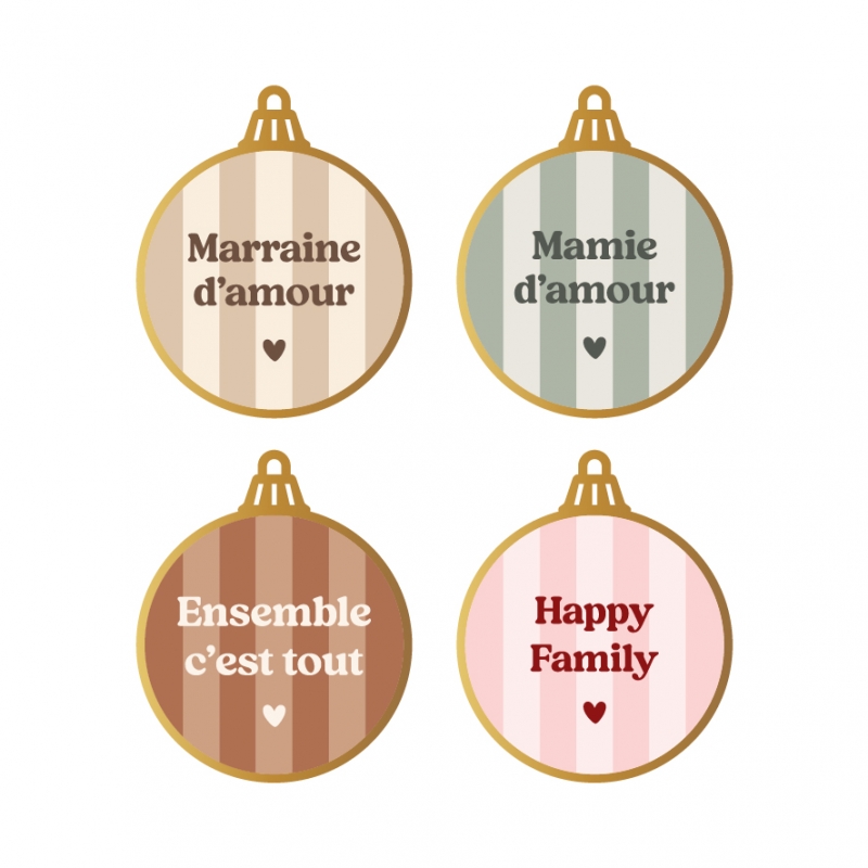 Offrez du style à votre sapin avec nos boules de Noël en plexiglas et au motif à rayures. Déclinées en plusieurs teintes, elles sont sublimées par un contour miroir champagne et une breloque "Joyeux Noël". Avec de nombreux textes au choix (mamie d’amour, petite sœur, tonton d’amour, frangine…), elles deviennent de véritables décorations symboliques représentant la famille.