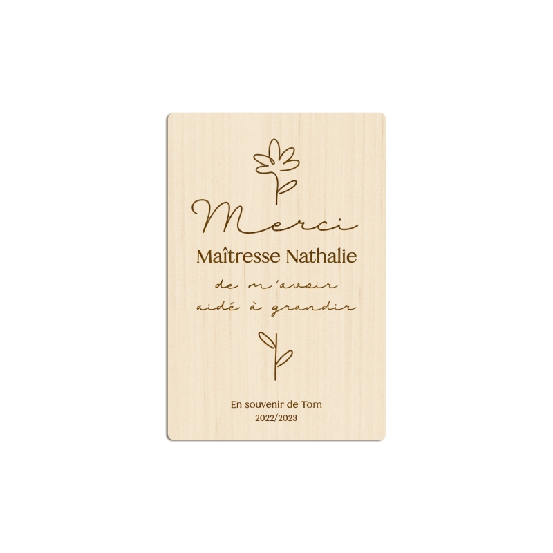 Carte postale en bois gravée au recto avec la phrase "Merci (destinataire) de m'avoir aidé(e) à grandir", ainsi que le prénom de l'enfant et l'année scolaire ; possibilité d'ajouter un texte personnalisé au verso (en option). Vous pouvez également ajouter un mot manuscrit au verso en utilisant un stylo à bille.