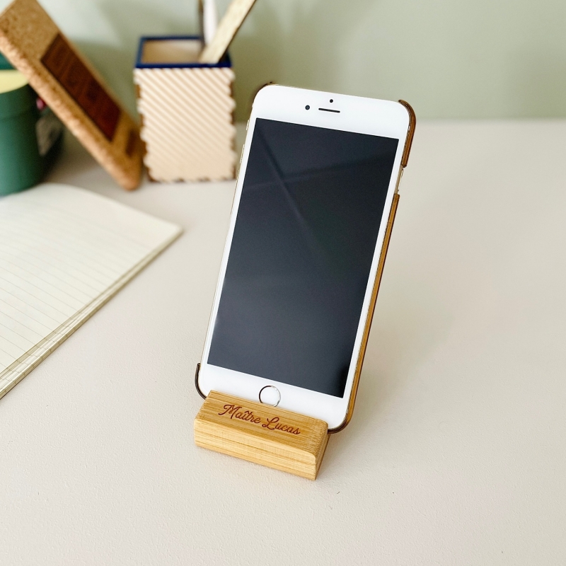Ce support de téléphone ou tablette en bois de bambou est une idée astucieuse pour remercier le maître de votre enfant à la fin de l’année scolaire. Il lui permettra de poser son téléphone sur son bureau avec élégance, tout en gardant un souvenir personnalisé de sa classe.
