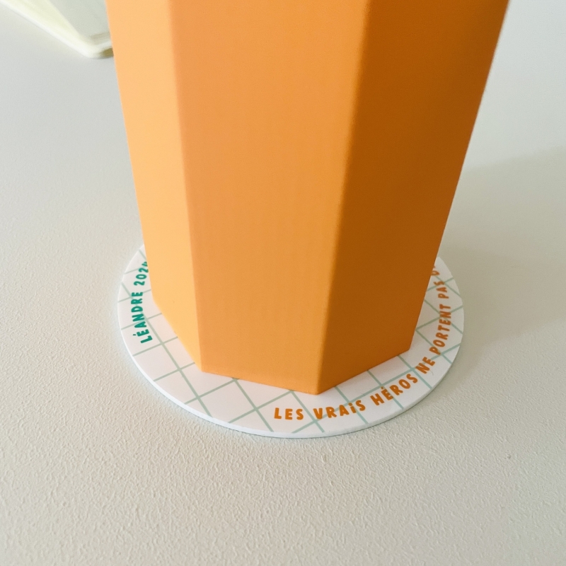 La commande de l'Organicolor comprend la réalisation d'un pot à crayons en PLA orange et d'un socle en plexiglas rond avec un message à personnaliser et le prénom de l'enfant.