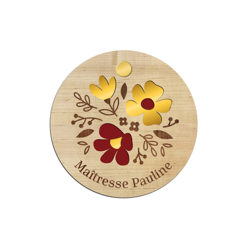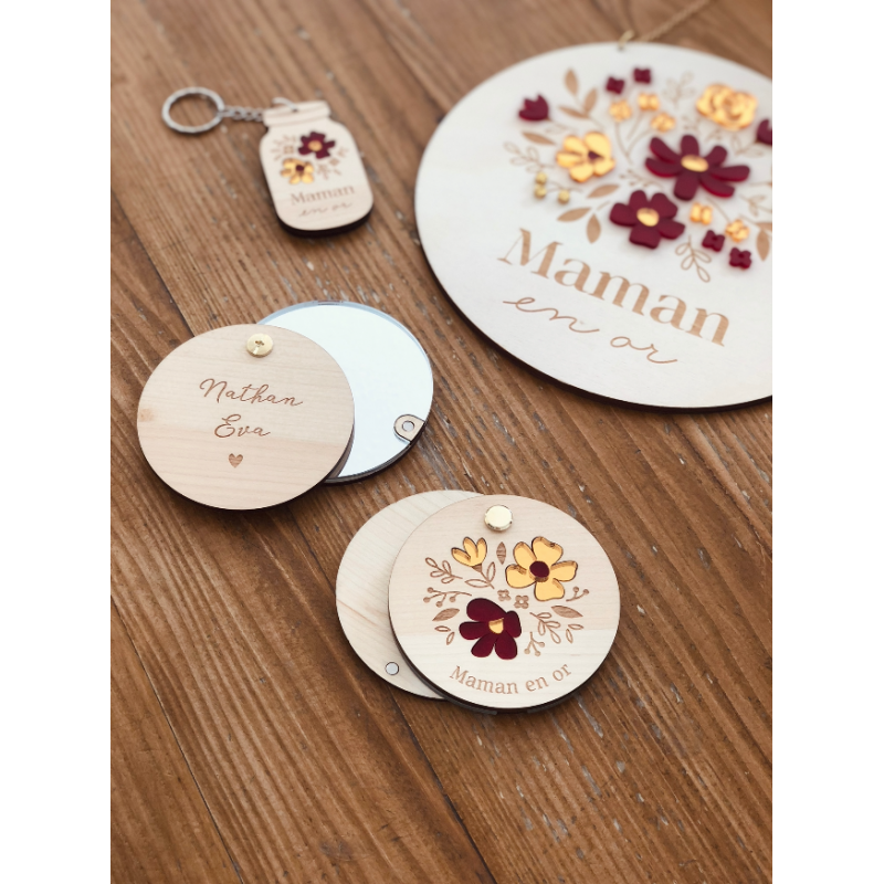 Offrez un joli miroir de poche à la maîtresse ou à la nounou de votre enfant pour la remercier de cette jolie année. Ce modèle vous plaira pour son design fleuri et printanier avec ses 3 petites fleurs en gravure ou en plexiglas de couleur (en option). À l'arrière, vous pouvez écrire le prénom de l'enfant pour en faire un cadeau personnalisé et unique.