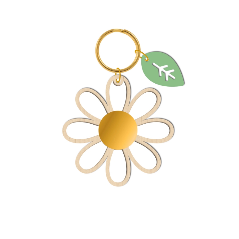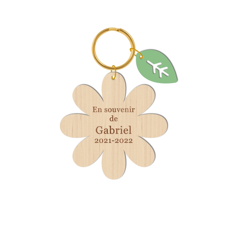 Joli porte-clés en forme de marguerite accompagnée d'une petite feuille verte pastel. Un cadeau original qui sera parfait pour remercier la maîtresse, l'atsem, la nounou ou le personnel de crèche qui se sont occupés de votre enfant. Une petite attention qui lui fera forcément plaisir !