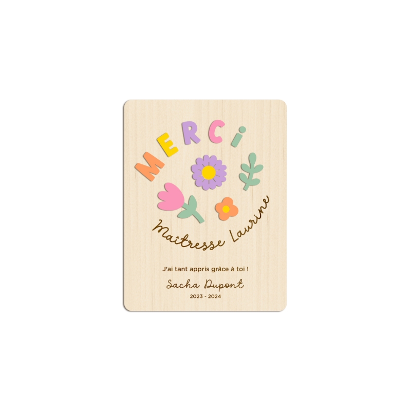 Grâce à cette jolie carte postale, remerciez la maîtresse, l'atsem, la nounou, le personnel de crèche... toutes les personnes qui se sont occupées de votre enfant cette année. Vous allez adorer cette jolie carte en bois avec ses fleurs pastel et son message gravé à personnaliser.