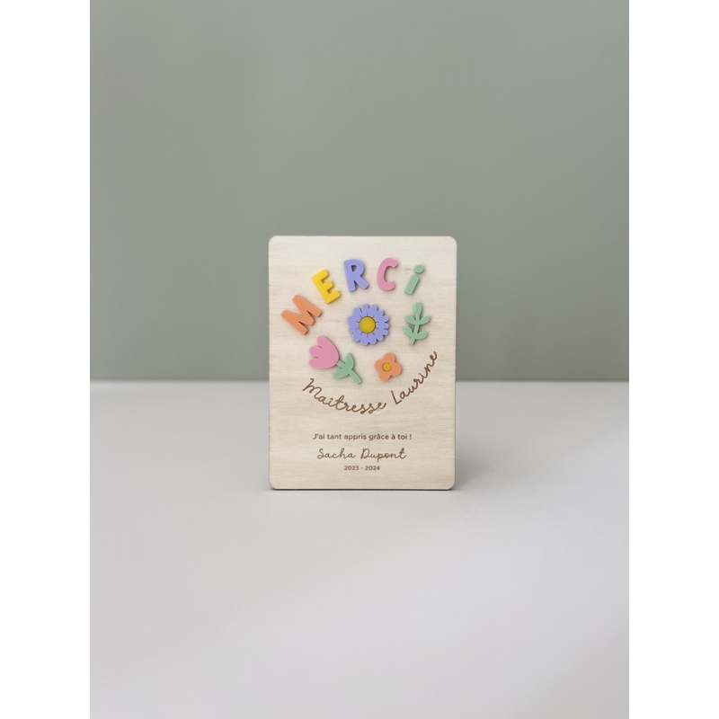 Carte postale en bois à personnaliser avec votre message et le prénom de votre enfant. Le mot "Merci" et les fleurs sont en plexiglas pastel, assemblés dans notre atelier.