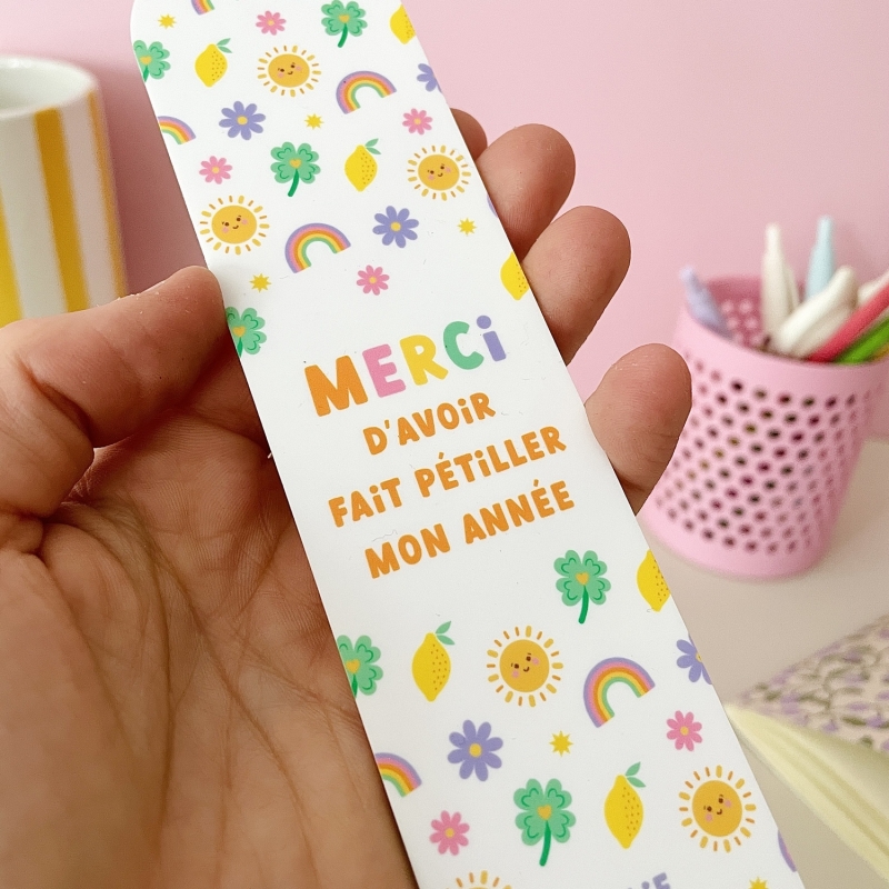 Ce marque-page personnalisé est une belle idée pour remercier la maîtresse en fin d’année. Ses illustrations ensoleillées, sa personnalisation et son message original en font un souvenir original et utile, à glisser dans chaque livre.