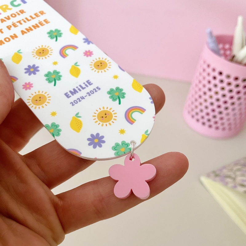 Offrez un joli marque-page personnalisé à la maîtresse de votre enfant ! Coloré, joyeux et fabriqué en France, il est parfait pour lui souhaiter de belles lectures tout en gardant un souvenir de l’année scolaire.