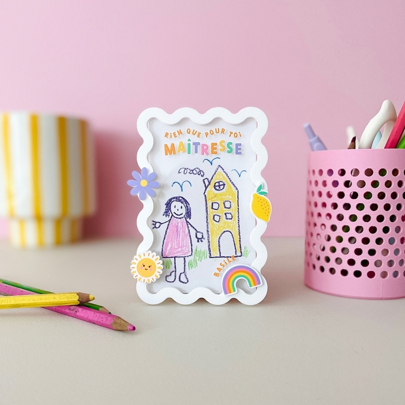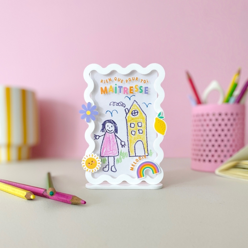 Conçu pour y glisser un dessin ou une photo, ce magnet coloré porte un message chaleureux et peut être personnalisé avec le prénom de l’enfant. Il apportera une touche de gaieté tout en évoquant un précieux souvenir de l’année scolaire.