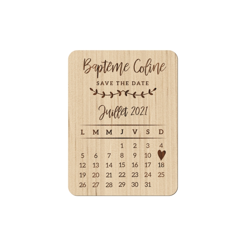 Envoyez à vos proches ces magnets en bois en guise de save the date pour annoncer le baptême de votre enfant. Grâce à son petit calendrier, les invités pourront s'en servir en guise de "mémo" sur leur réfrigérateur.