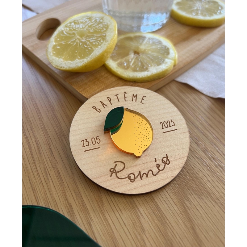 L'anniversaire de votre enfant est sur le thème de l'été ou des agrumes ? Ces magnets citron seront parfaits pour illustrer la saison ! À personnaliser avec votre texte, vous pourrez également choisir que le citron soit gravé ou réalisé en plexiglas miroir pour donner de la couleur et du pep's ! Ces magnets en bois peuvent être envoyés en guise de save the date ou à donner en cadeaux d'invités.