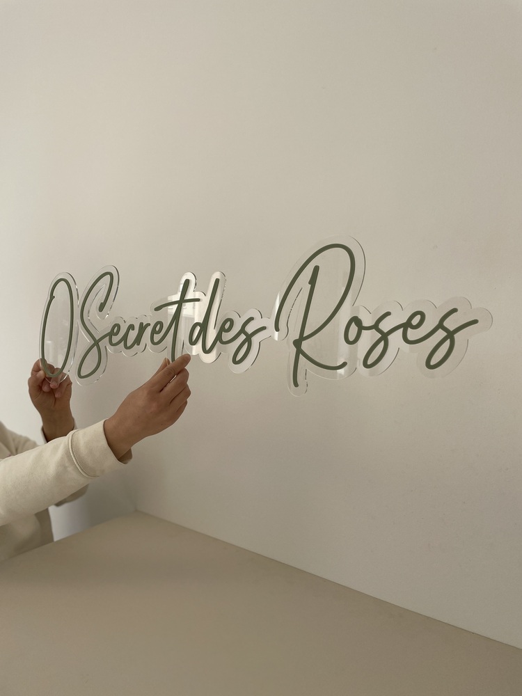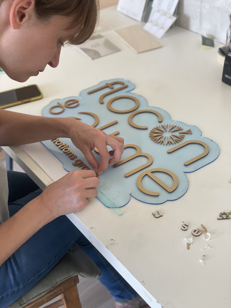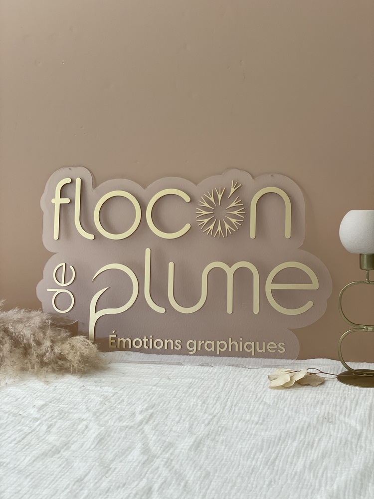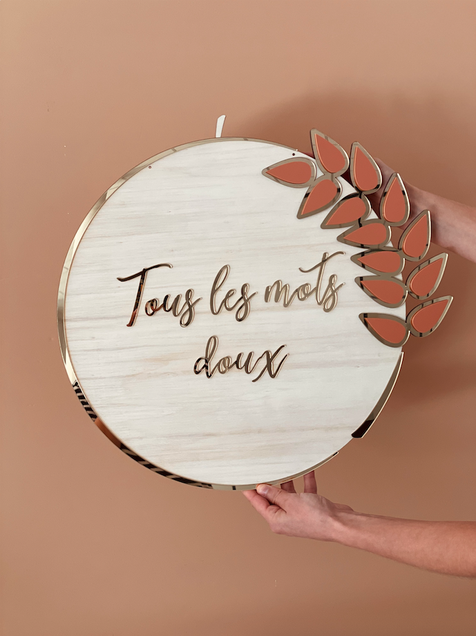 Jolie enseigne réalisée à partir du logo de "Tous les mots doux". Le logo en 3D a été réalisé en 50 cm sur base de bois peuplier et avec une application de différents plexiglas pour donner du relief et de la couleur à l'enseigne. Ici, en miroir champagne pour le contour et le nom de la marque et une sur-épaisseur en mat terracotta pour le feuillage.