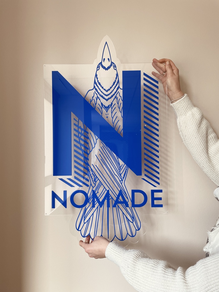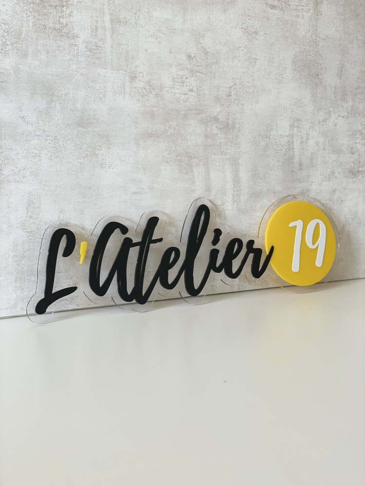 Une enseigne sur-mesure réalisée à partir du logo de l'espace de coworking beauté NOMADE. Cette enseigne est une pure merveille de plexiglas. Un petit challenge pour l'atelier également puisqu'il a fallu transformer un logo graphiquement complexe en objet 3D sans se perdre dans une multitude de pièces différentes à assembler. On adore le rendu de cette enseigne logo au format 50 x 80 cm alliant plexiglas translucide et gloss bleu électrique.
