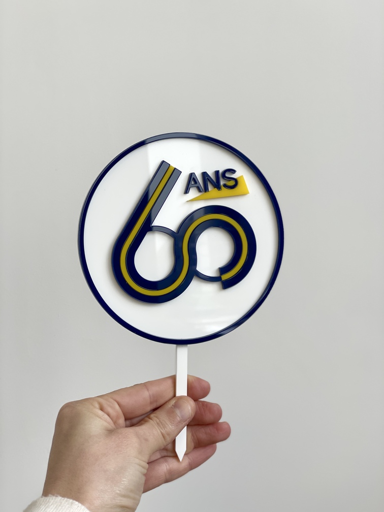 Réalisation sur-mesure d'un cake topper en plexiglas pour les 60 ans de l'école de management IÉSEG. La figurine de gâteau a été réalisée au format 13 x 20 cm avec un assemblage complexe mêlant plexiglas gloss blanc, gloss bleu nuit et satin jaune citronnelle.