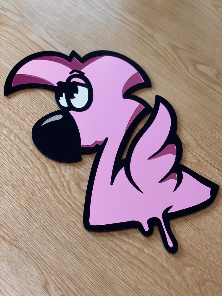 Pour ce flamant rose, une multitude de plexiglas ont été utilisée pour recréer le plus fidèlement possible le dessin d'origine. Nous avons ainsi utilisé du plexiglas noir et blanc, ainsi que du pastel rose et miroir rose.