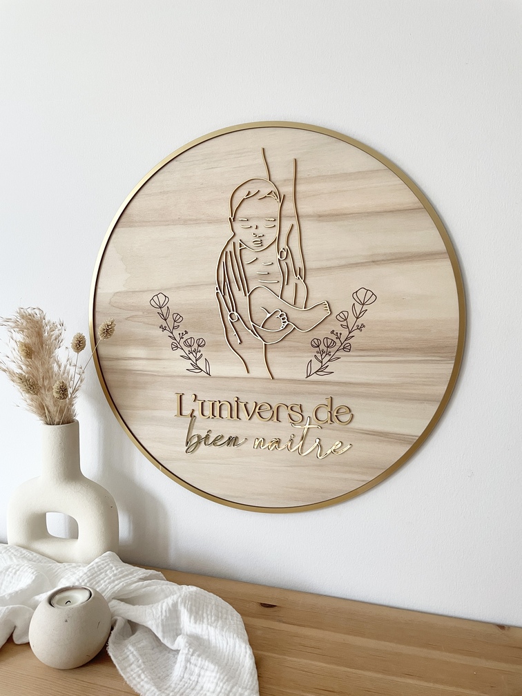 Leïla nous a contacté afin de réaliser son logo pour "L'univers du bien naître" en 50 cm avec une base en bois peuplier et le logo en plexiglas métallisé or, elle avait une idée très précise de ce qu'elle souhaitait. Le résultat est vraiment top avec le bébé en relief et les végétaux en gravure. Un rendu aussi doux et délicat que son métier qui permet à vos nouveaux nés de bénéficier de massages et de soins adaptés et par une professionnelle.