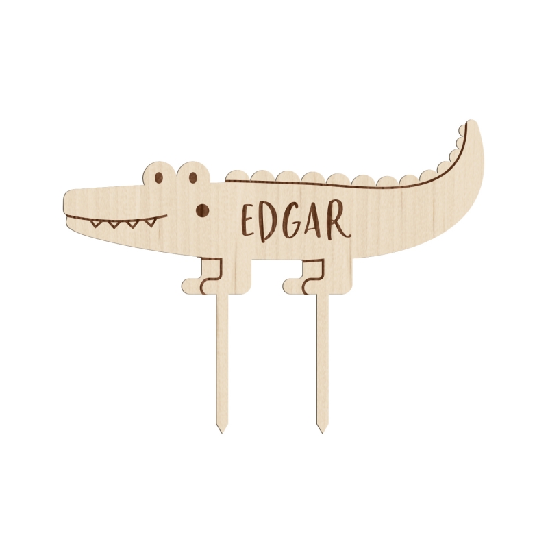 Pour l'anniversaire safari de votre enfant, personnalisez un mignon crocodile en cake topper. Cette figurine en bois ou en plexiglas sera la pièce maîtresse de votre gâteau. En le personnalisant avec son prénom, vous pourrez le réutiliser à chaque anniversaire de votre enfant.
