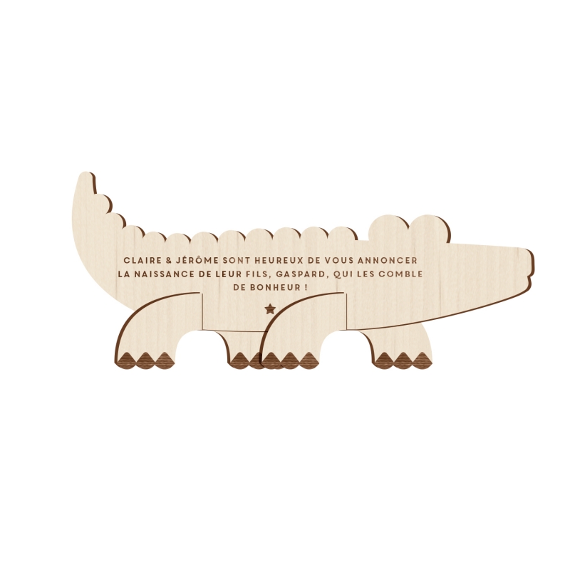Annoncez à vos proches la naissance de votre enfant grâce à ces faire-part en bois originaux ! Vous allez adorer ce concept unique de faire-part en kit à assembler en forme de petit crocodile. Chaque animal voit le jour dans notre atelier alsacien, de l'idée à la fabrication en passant par l'assemblage. Un idée originale et unique 100% made in France pour annoncer la naissance de bébé.