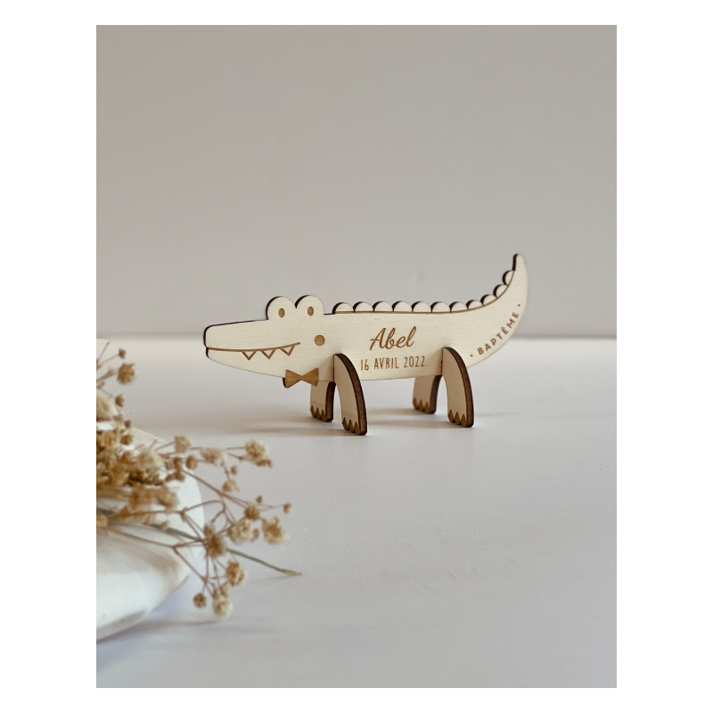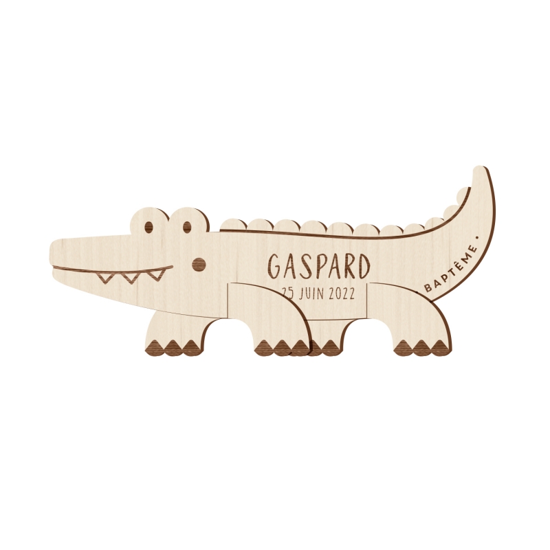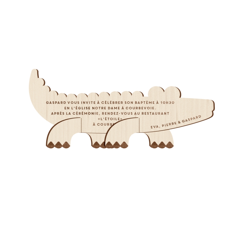 Pour le baptême de votre enfant, envoyez des faire-part orignaux et uniques en forme de crocodile. Vous pouvez les offrir en guise de save the date en personnalisation uniquement le recto ; ou en véritable invitation en indiquant également les informations au verso. Chaque invitation en bois est réalisée par le plus grand soin dans notre studio alsacien, de la personnalisation à l'emballage.