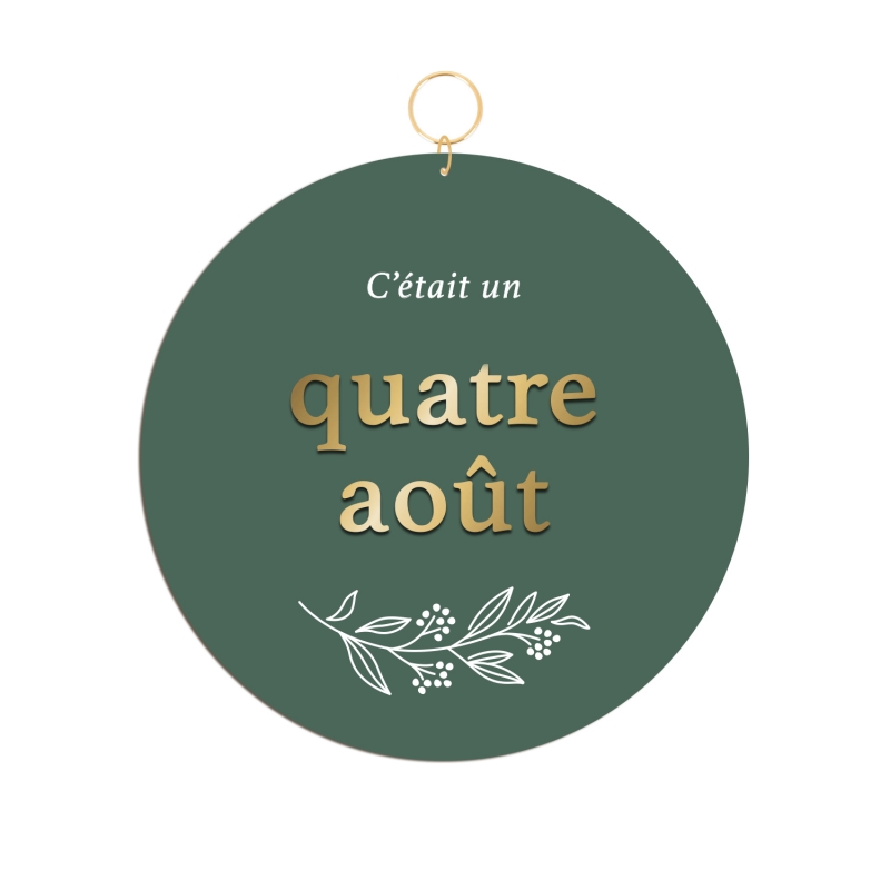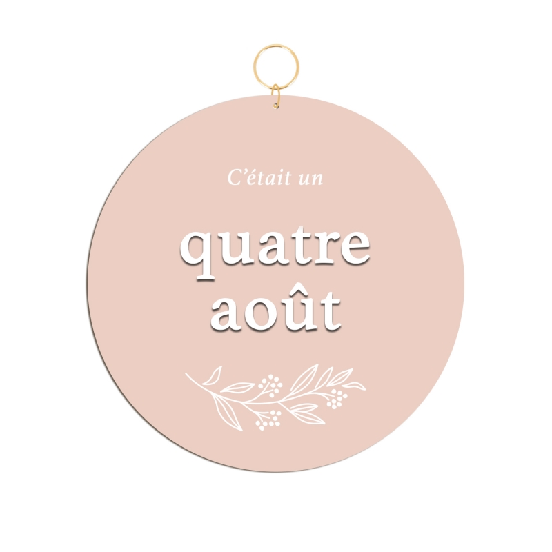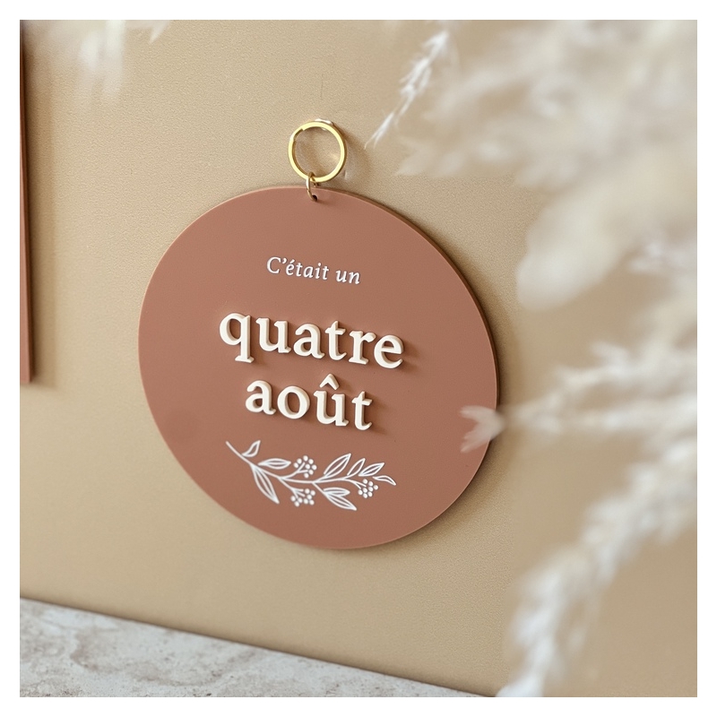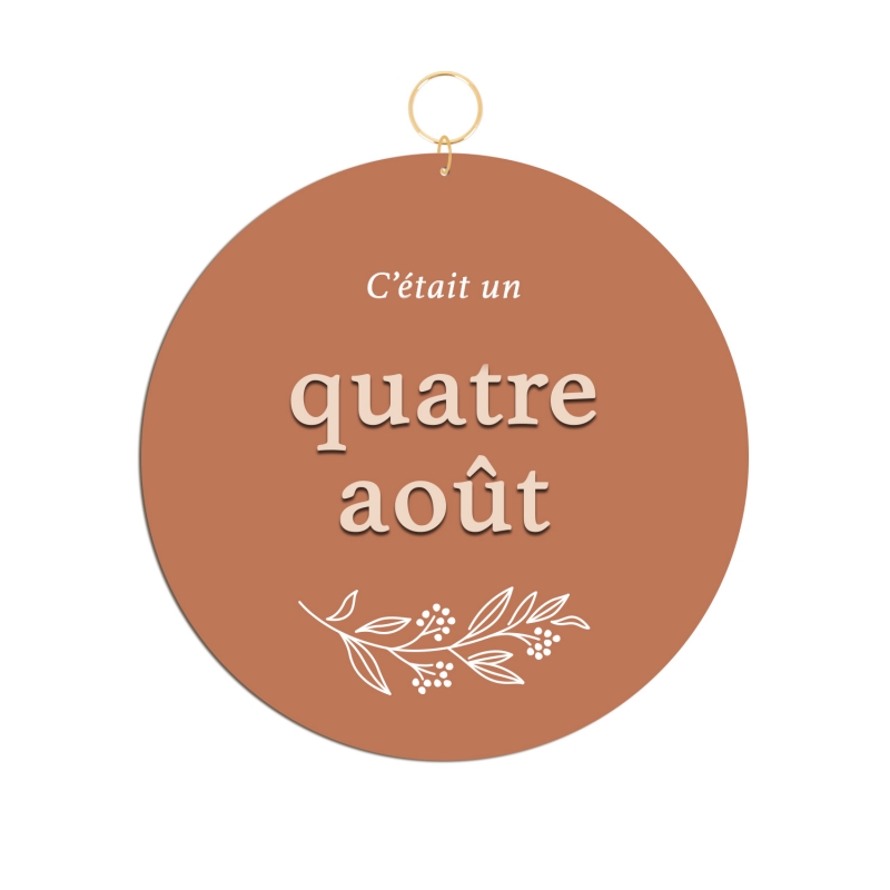 La commande comprend la personnalisation de la date de votre choix en toutes lettres (sans l'année ni chiffre), ainsi que sa fabrication dans les matières choisies. Les lettres qui composent la date sont collées manuellement sur le médaillon et le brin végétal peint à la main (dans le cas du plexiglas).