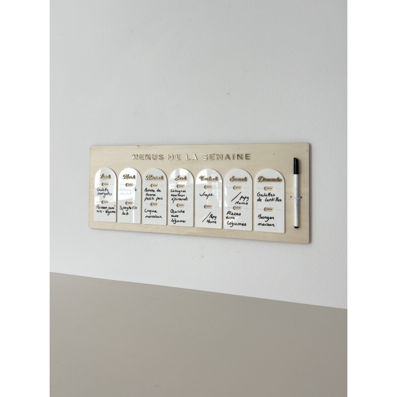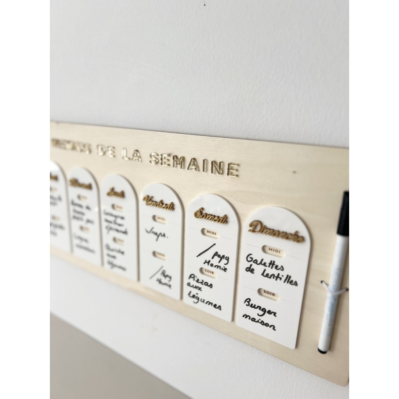 Découvrez notre planning de menus de la semaine en bois, effaçable et réutilisable à volonté. Idéal pour bien organiser vos repas hebdomadaires, il ajoute une touche élégante à votre cuisine tout en vous aidant à mieux planifier vos repas. Grâce à ses séparateurs, vous pourrez inscrire un menu le midi et le soir.