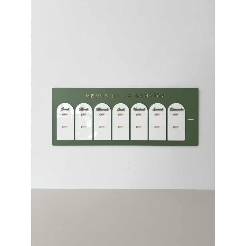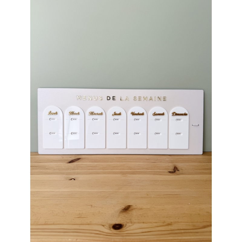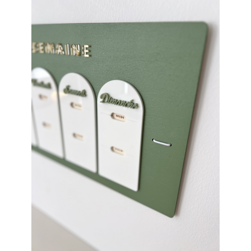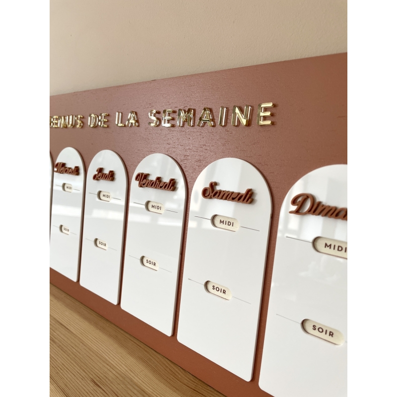 Le fond du planning est disponible en bois brut ou en bois peint de couleur (terracotta, sauge, rose poudré ou lin). Les cases et titres sont en plexiglas.