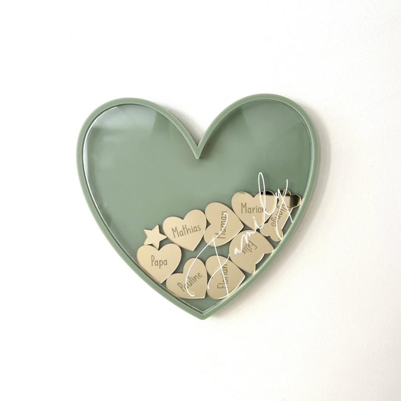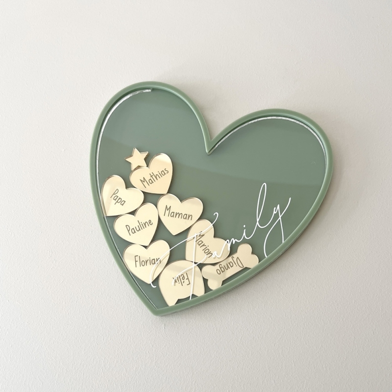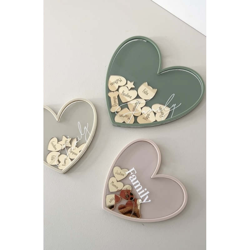 Vous allez adorer cette décoration murale unique en forme de coeur, remplie de petits coeurs représentant votre famille ! Une décoration à accrocher symbolique et 100% à votre image. Sur chaque élément, inscrivez le prénom de vos enfants, de votre moitié, de votre animal ou de votre étoile... Une décoration unique à s'offrir et à offrir !