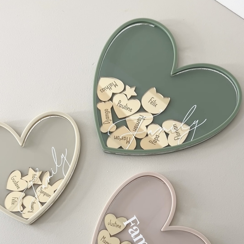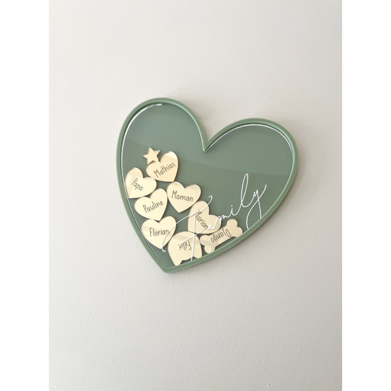 Jolie décoration murale unique en forme de coeur, remplie de petits coeurs représentant votre famille ! Une décoration à accrocher 100% à votre image et symbolique. Sur chaque élément, inscrivez le prénom de votre famille, de vos êtres partis trop tôt ou de votre animal de compagnie... Une décoration unique à s'offrir et à offrir !