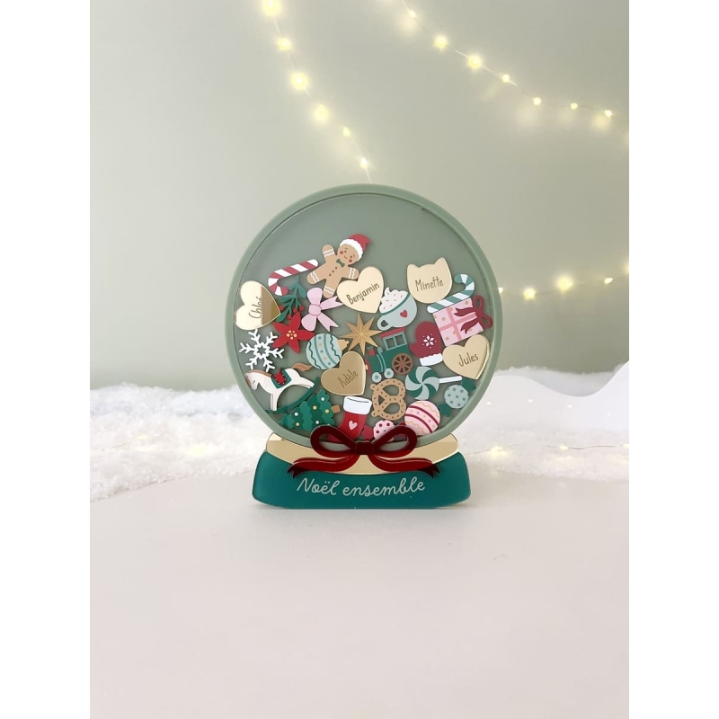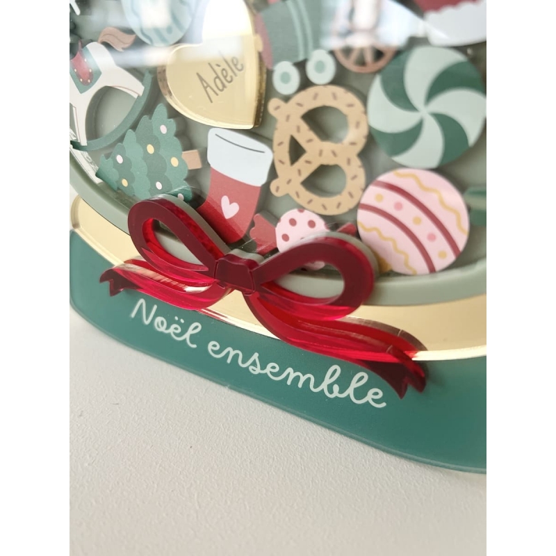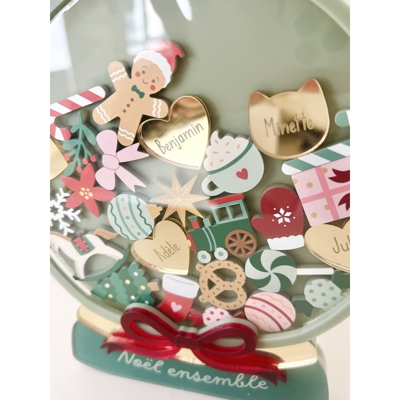 Cette décoration de Noël à poser évolutive se compose d’une boule à neige revisitée que vous pouvez remplir selon vos envies : à l’intérieur, des petits coeurs en miroir champagne gravés aux prénoms des membres de votre famille, le tout entouré par des confettis aux formes emblématiques de Noël (pain d’épices, bottes de Noël, gant, sapin, flocon, cheval à bascule, cadeau, sucre d’orge et bien d’autres détails colorés).