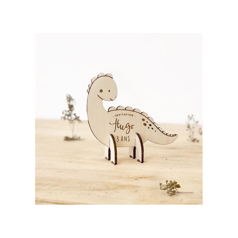 Jolie décoration en bois en forme de dinosaure pour la chambre de votre enfant. Le dinosaure est personnalisé au recto avec le texte de votre choix (prénom, date, âge, mot "baptême", etc). Vous pouvez offrir la décoration en guise de cadeau de naissance ou la personnaliser pour décorer le lieu du baptême de votre enfant, les possibilités sont multiples !