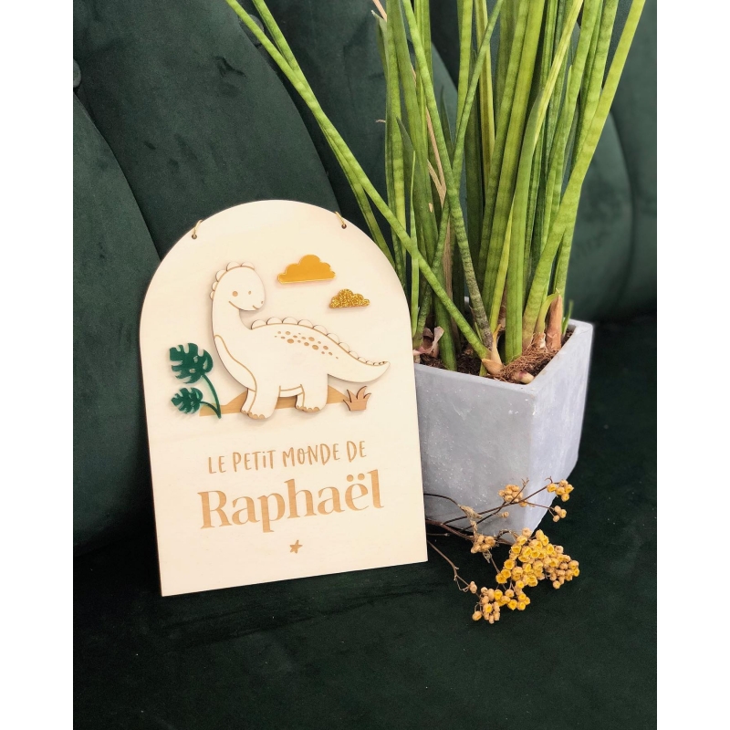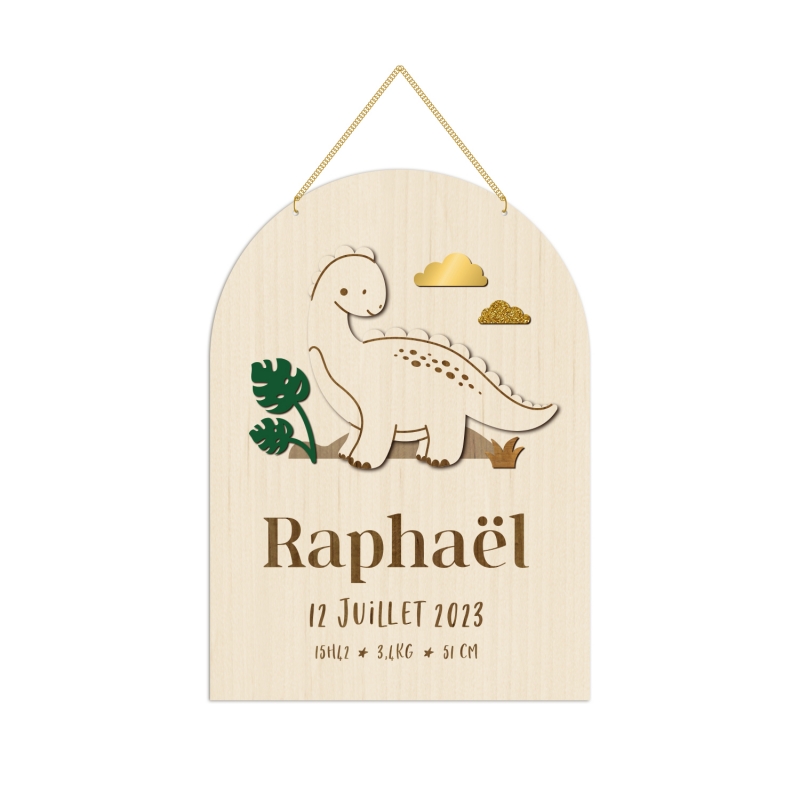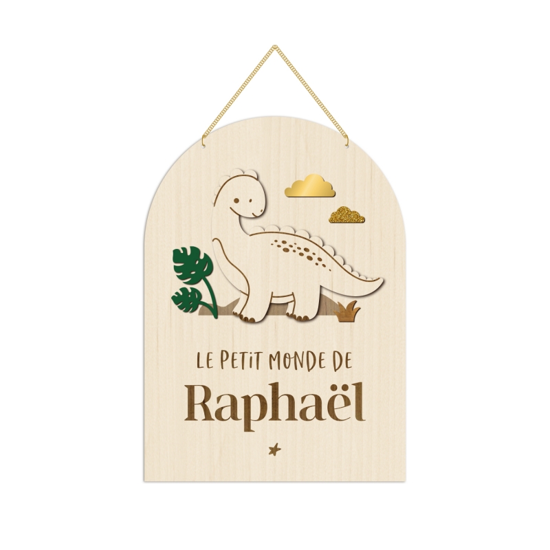 Jolie pancarte en bois personnalisée avec le prénom de votre enfant et illustrée d'un petit dinosaure. Grâce à sa fixation avec une chaine dorée, vous pourrez l'accrocher sur la porte de la chambre ou la suspendre dans la chambre. Le dinosaure est réalisé en relief en bois peuplier et le décor autour peut être soit gravé soit en plexiglas colorés.