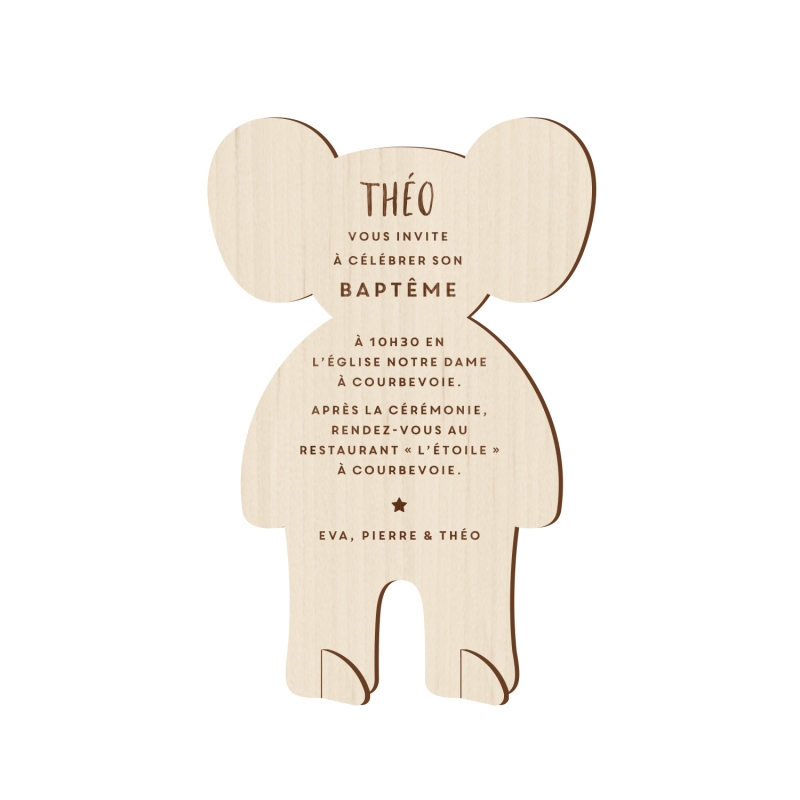 Vous cherchez un faire-part de baptême original et tendance ? Vous allez adorer ce petit éléphant en bois qui tient debout ! Grâce à de petits pieds en bois, vos invités pourront donner vie à votre invitation et l'utiliser en décoration. Vous pouvez personnaliser le recto avec les informations (prénom de l'enfant et jour du baptême) et ajouter au verso un petit texte d'invitation.