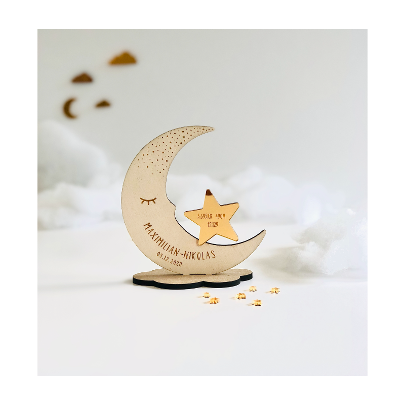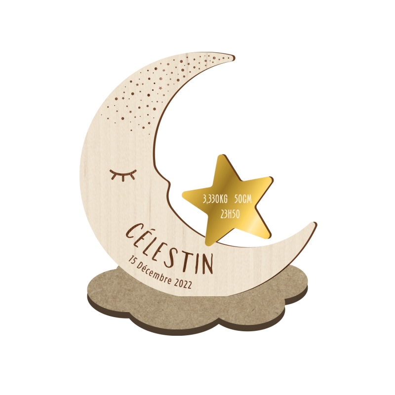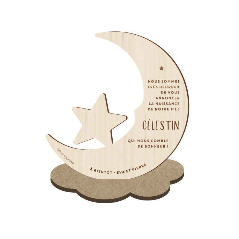 Annoncez l'arrivée de bébé avec un faire-part de naissance original et tout en douceur : le faire-part lune. Grâce à son socle en bois en forme de nuage, vos proches pourront le conserver en décoration. Au recto, le prénom et la date de naissance sont gravés sur la lune et les informations supplémentaires (poids, taille et horaire) sur une étoile en plexiglas miroir (or, argent ou rose gold).