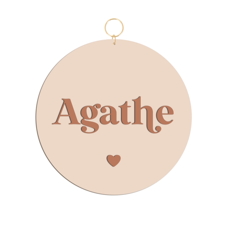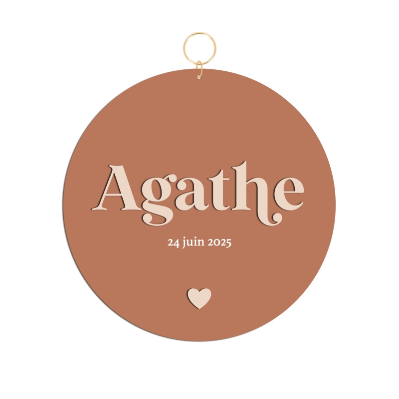 La commande comprend la personnalisation du prénom de l'enfant, ainsi que sa fabrication dans les matières choisies. Les lettres qui composent la date sont collées manuellement sur le médaillon et le brin végétal peint à la main (dans le cas du plexiglas).