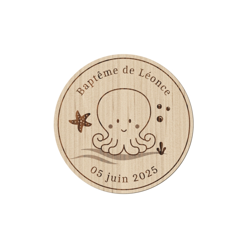 Pour le baptême ou l'anniversaire de votre enfant, personnalisez ces jolis magnets en bois illustrés d'un mignon petit poulpe. Ces aimants seront parfaits pour offrir à vos proches en guise de cadeaux d'invités.