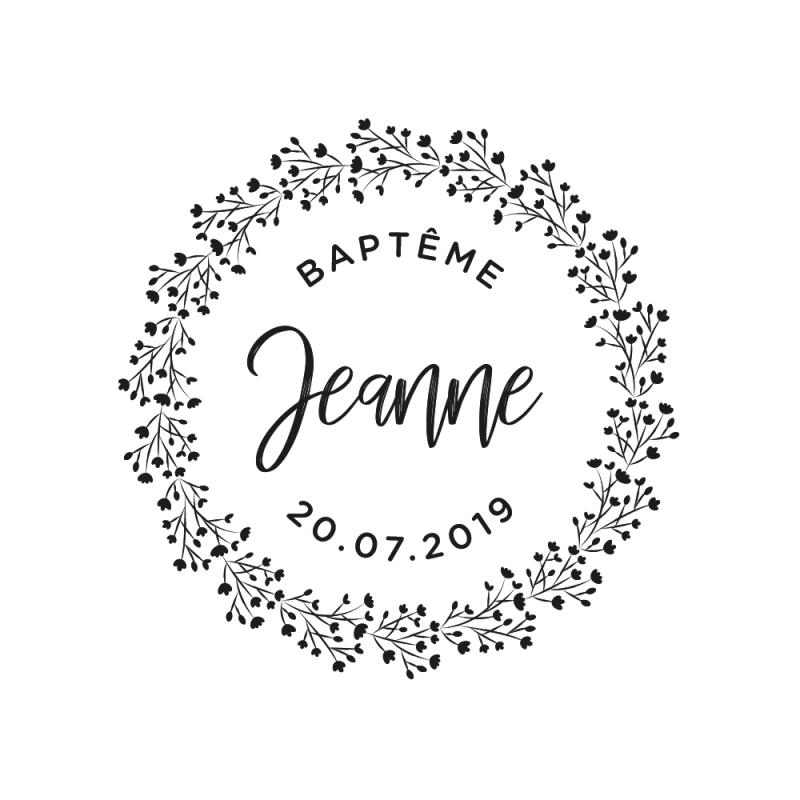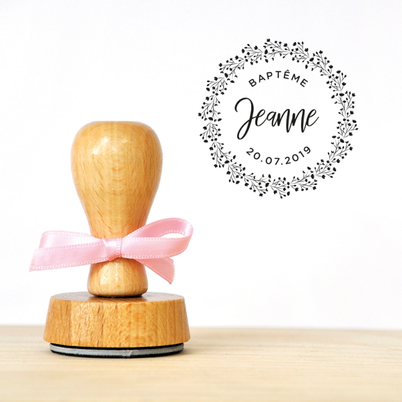 Pour le baptême ou la naissance de votre enfant, personnalisez un joli tampon encreur en bois. Le modèle Couronne de gypsophile mettra parfaitement en valeur le prénom de votre enfant et il sera parfait pour un thème champêtre.