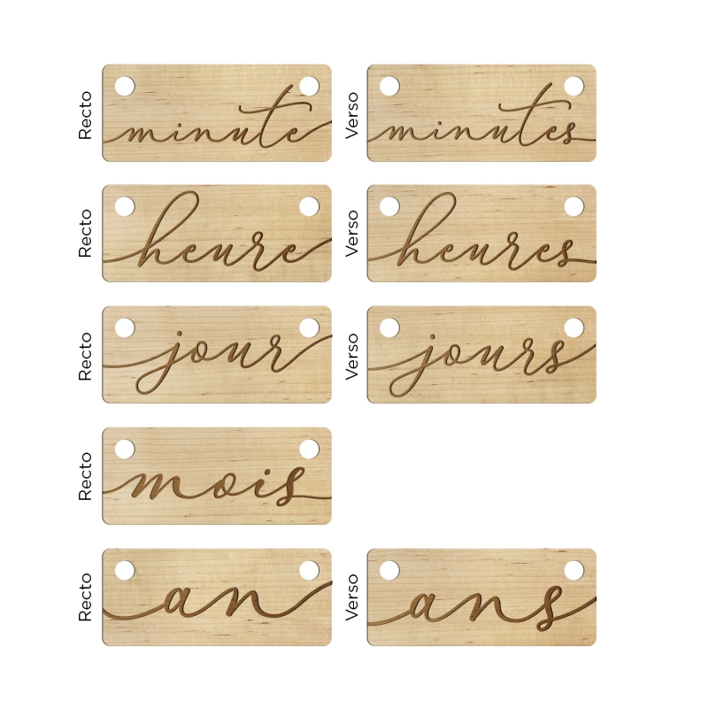 Le lot comprend une pancarte en bois finement gravée, 19 chiffres en bois plaqué et les pièces temporelles que vous aurez choisi dans le menu déroulant ci-dessous.