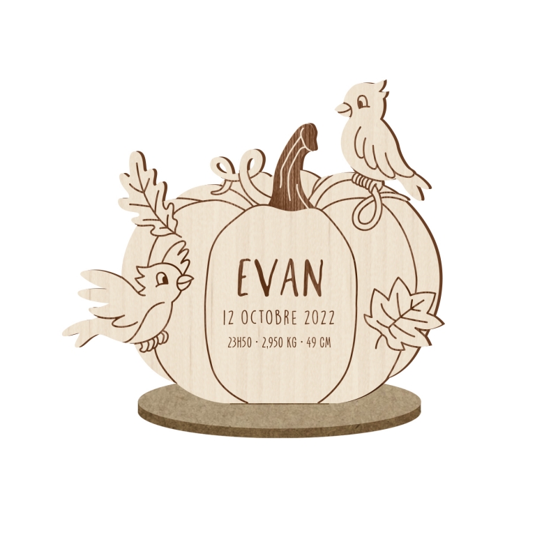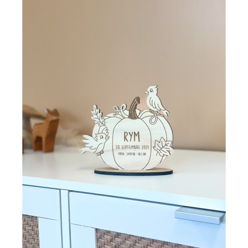 Annoncez l'arrivée de votre enfant avec un faire-part de naissance original en forme de petite citrouille. Bien plus qu'un faire-part papier traditionnel, c'est une décoration unique en bois que vos convives devront assembler pour lui donner vie. La petite citrouille sera un clin d'oeil parfait pour les bébés nés en automne.