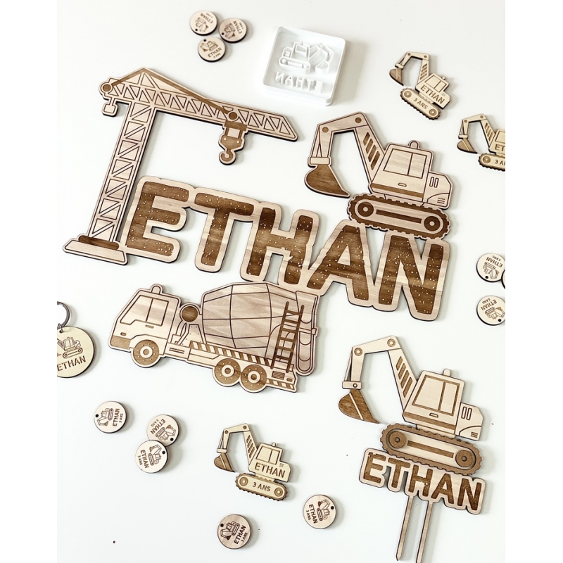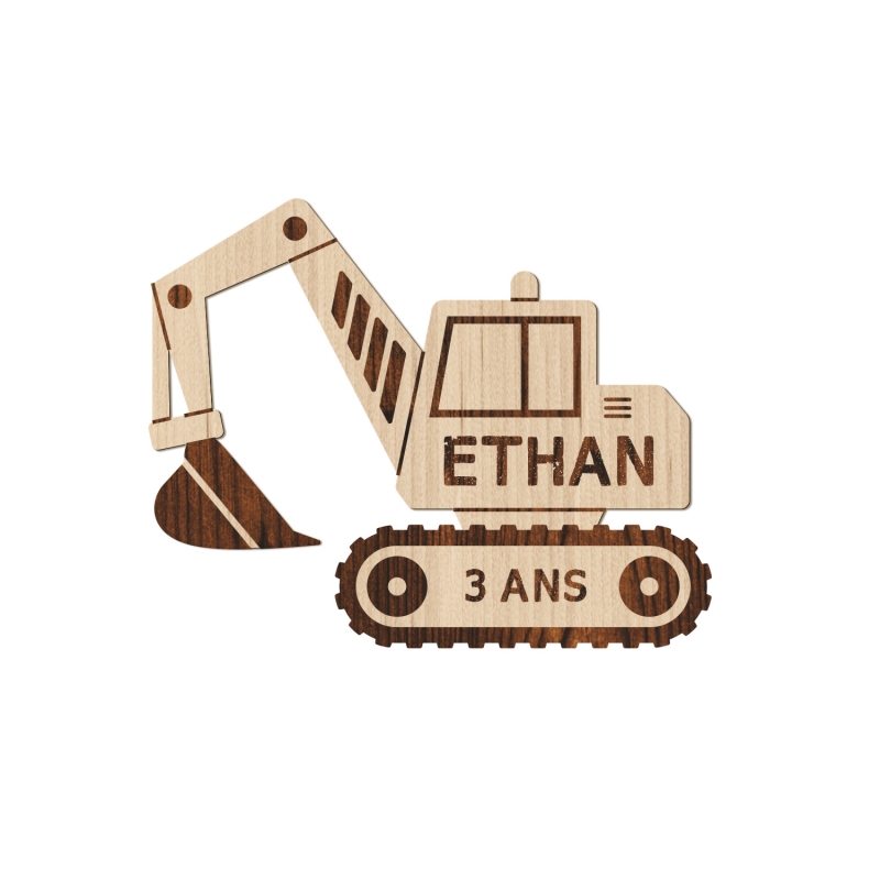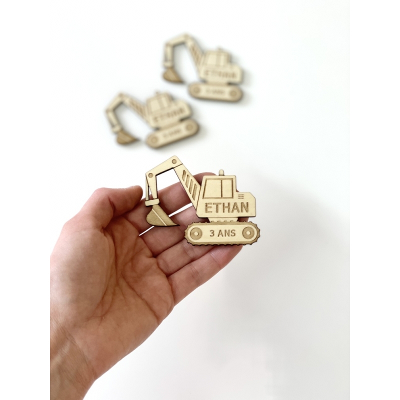 Joli magnet en bois personnalisé en forme de pelleteuse, parfait pour un anniversaire engins de chantier. À offrir en guise de save the date ou en cadeaux d'invités pour les remercier de leur venue.