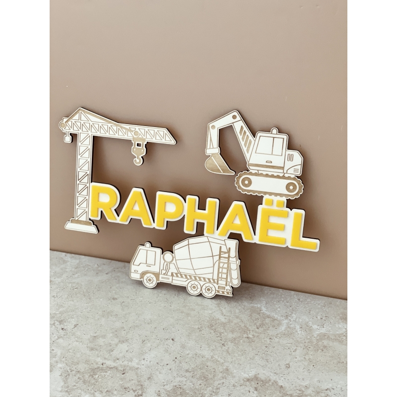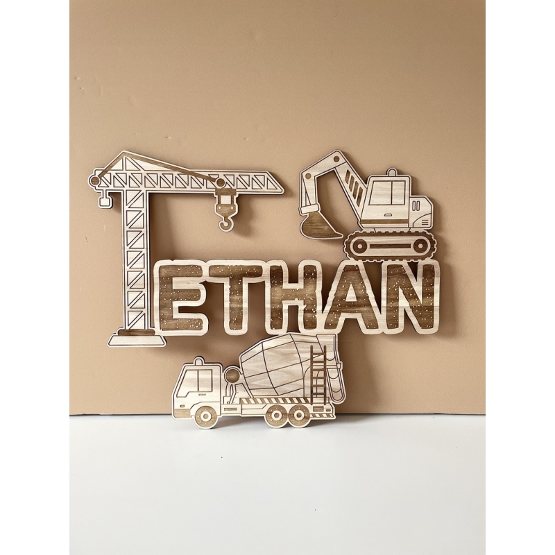Vous allez adorer cette décoration murale avec ses 3 engins de chantier (pelleteuse, camion toupie et grue) et à personnaliser avec le prénom de votre enfant. Cette décoration en bois sera parfaite pour décorer la chambre de votre enfant de manière originale et personnalisée !