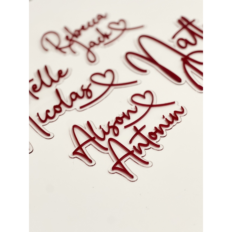 Le tarif comprend la composition graphique des 2 prénoms, ainsi que la découpe selon les matières et le format choisis dans les menus déroulants.