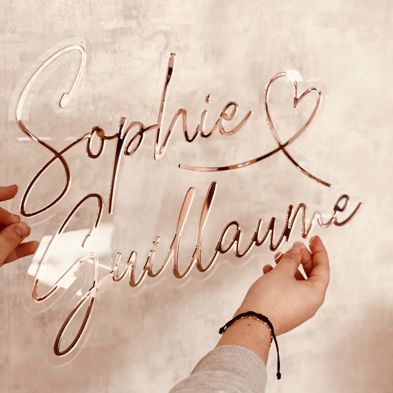 Pour que la composition soit harmonieuse au maximum selon vos prénoms, l'emplacement du coeur peut varier. Nous réalisons l'enseigne sur-mesure et nous nous assurons que le produit final est à la fois harmonieux visuellement et solide pour l’envoi. Vous n'aurez donc pas la même composition que le modèle présenté sur les photos.