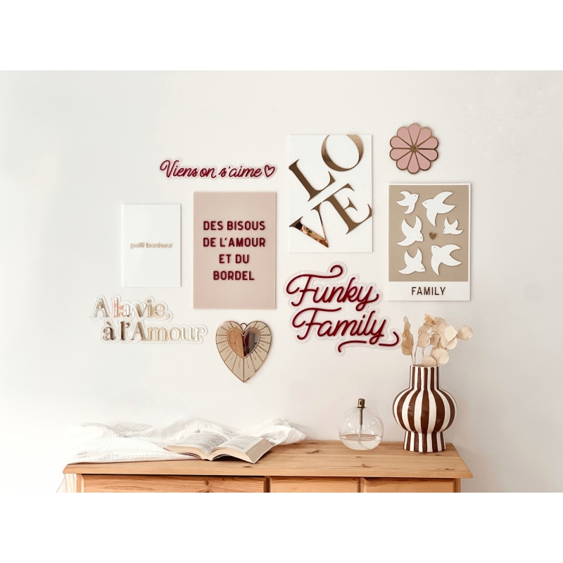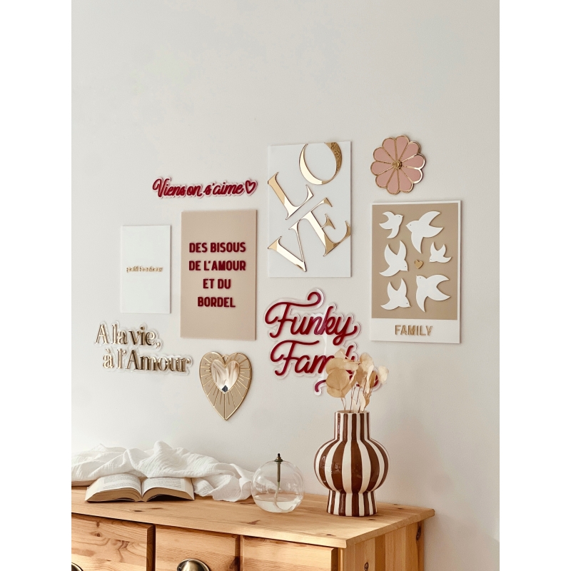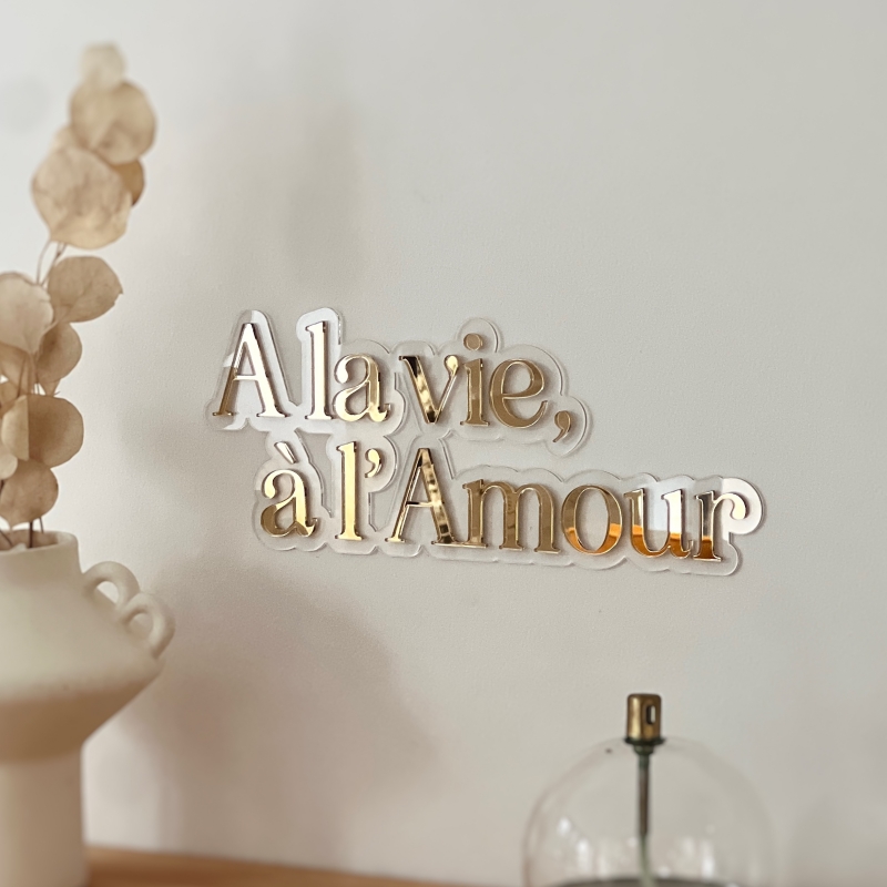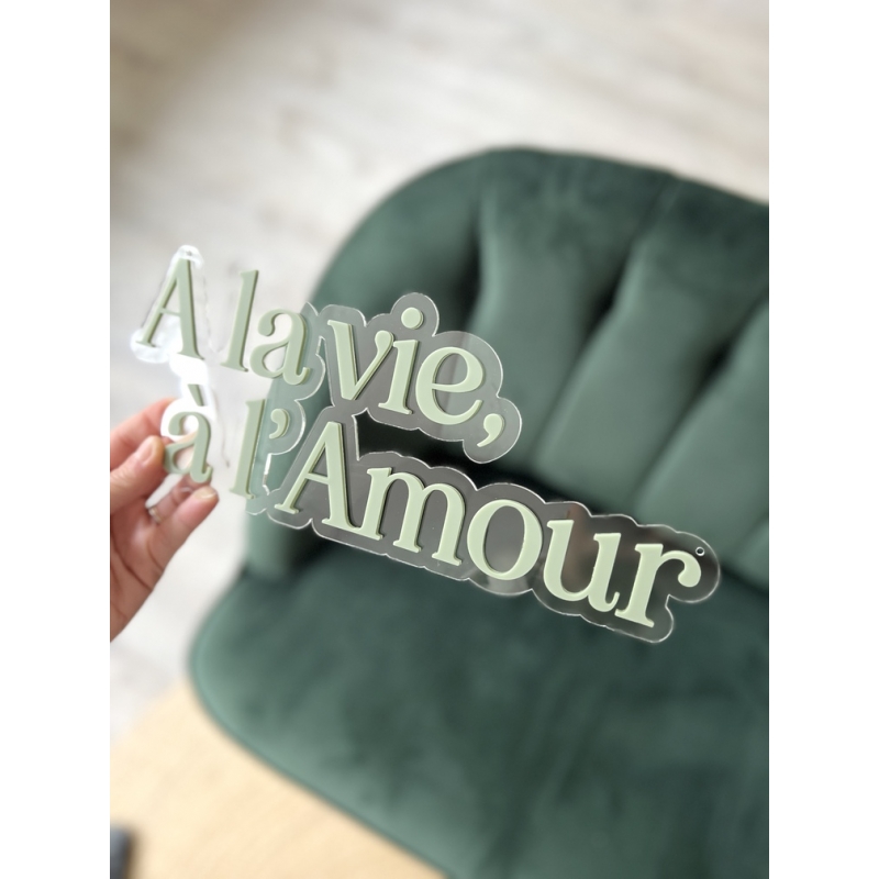 Coup de coeur pour cette enseigne style néon avec le message "A la vie, à l'Amour". Sur le socle en plexiglas transparent, vous pourrez choisir d'écrire la citation dans le plexiglas de votre choix afin de coller à votre décoration d'intérieur ou de mariage. Une jolie décoration murale originale qui plaira à coup sûr !