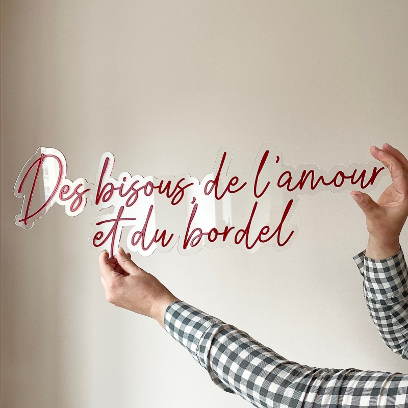 Ajoutez du pep's et du fun à votre décoration d'intérieure grâce à cette enseigne style néon avec la citation "Des bisous, de l'amour et du bordel". Coloris de plexiglas au choix pour coller à 100% à votre décoration !