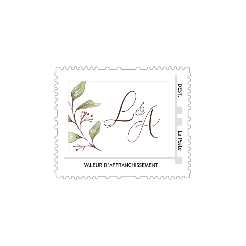 Print Your Love vous propose de réaliser le fichier numérique assorti à votre papeterie de mariage Eucalyptus pour réaliser des timbres poste personnalisés. Vous pourrez ainsi harmoniser le contenu de votre courrier avec l'enveloppe elle-même. Pour votre mariage végétal et naturel, personnalisez tout jusque dans les moindres détails !