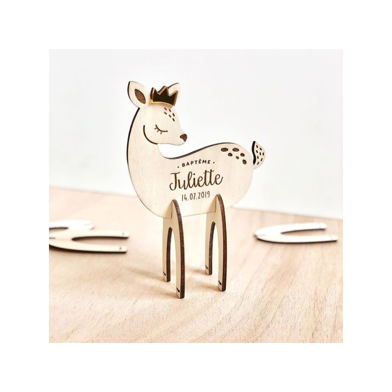 Vous cherchez des invitations baptême originales ? Laissez-vous séduire par ces faire-part en bois à assembler et en forme de petit faon. Bien plus qu'une simple invitation, vos convives pourront la conserver en guise de décoration en souvenir de ce joli jour.